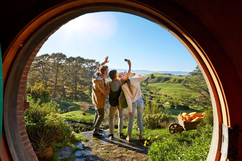 Begin your journey south, traveling through green meadows and rolling green hills to Hobbiton.(opens in new window) A guided tour of The Lord of the Rings' original movie set, will take you past the famous party tree, through a village of hobbit holes to Bag End, Bilbo and Frodo's iconic home.