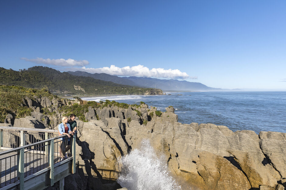 There a plenty of places to stop along the way, visit Paparoa National Park, explore stunning limestone caves in Charleston, or take a walk to Punakaiki's bizarre pancake rocks and booming blowholes. Dating back 30 million years, these rock formations are created by layers of limestone overlaid with rock and clay.