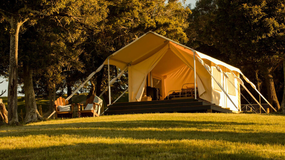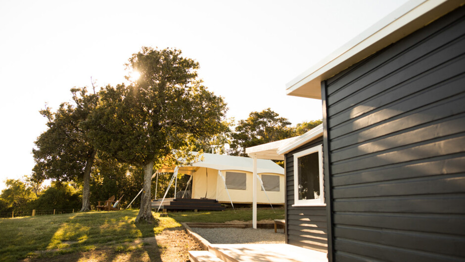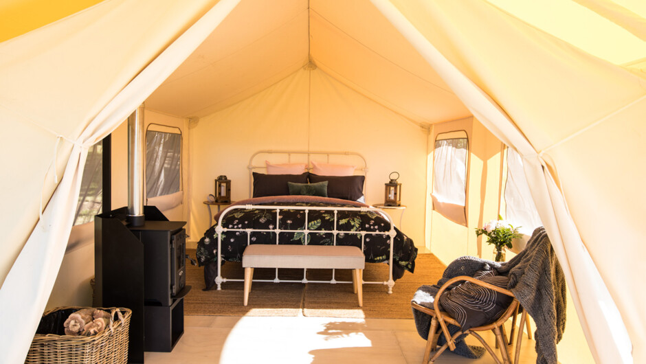 The campsite sits on a hilltop, within a patch of pretty native bush on the farm. Picturesque trees dotted around the site provide spots of welcome shade from the bright Wairarapa sunshine. The romantic, safari style tent is fitted out with a queen size bed, beautifully dressed in deluxe linen. A wood-burning stove keeps you cosy and warm, year round. Two stylishly renovated forestry huts accompany the tent, forming a roomy camp bathroom and kitchen. An additional outdoor covered barbeque area, provides a fantastic al fresco dining space. Two deep, claw-foot baths sit side-by-side, give you the chance to soak and relax together while you take in the sweeping 180 degree views over the rural Wairarapa countryside.
