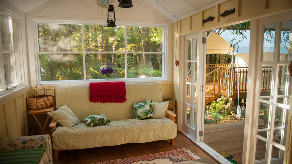 The escape is set in a dappled glade, in mature native forest on the edge of Highfield Farm. A large, luxury tent is accompanied by a delightful old kauri hut - providing a kitchen, dining and lounging area. A boardwalk through the tall native bush connects the two. A short walk away from the site sits a private outdoor bath in a rocky grotto, nestled amongst the bush and fern covered ground. Surrounded by nature, you can lie back in the outdoor bath and see native birds like tomtits, tui, grey warbler and native pigeon dart about the campsite in the early evening. A pretty stream meanders through the bush nearby. At night you'll hear the morepork calling from the treetops and if you're really lucky, the kiwi calling from the bush.