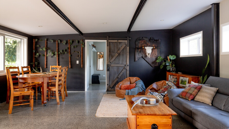 The cosy, rustic-modern converted cowshed sits on a lifestyle property surrounded by native plantings and birdlife.