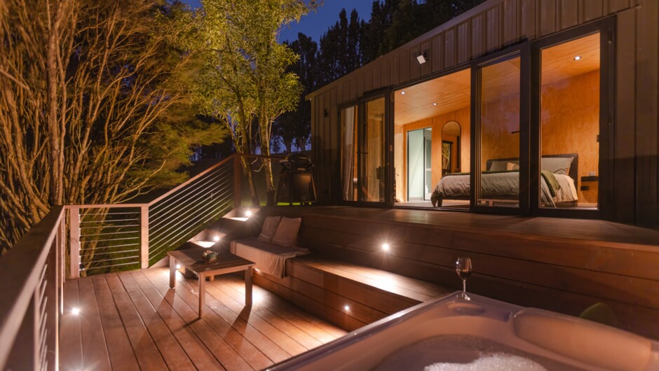 Step out onto the deck, where a BBQ and soft lights that create a warm glow, especially beautiful as you soak in the outdoor bath under the night sky.