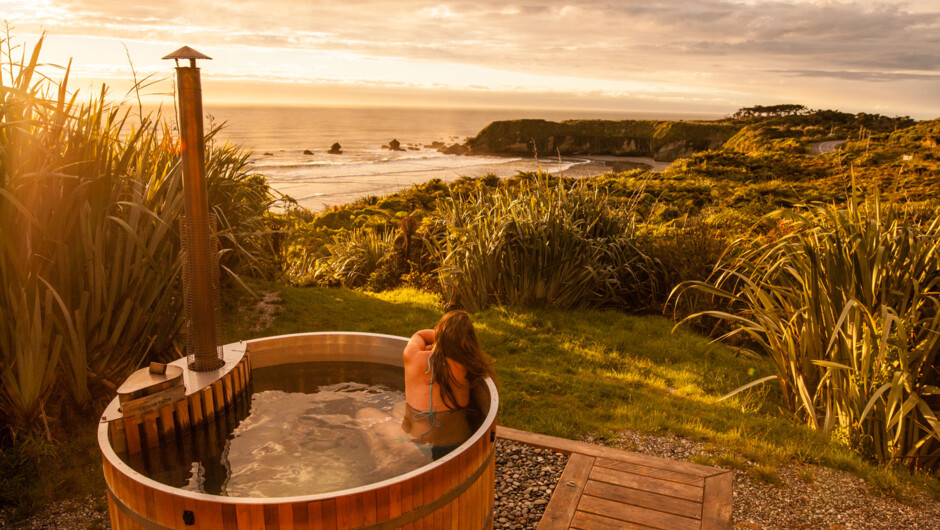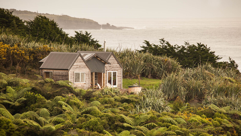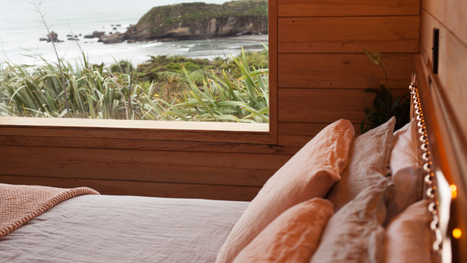 Woodpecker Hut consists of two small, off-grid timber huts, adjoined by a covered outdoor kitchen and living area. One hut is the master bedroom - with a luxurious king size bed. The other is a comfortable lounge hut, with a wood-burning stove and second queen bed for extras. Waney edge weatherboard and native timber lining give the huts a rustic, natural charm. The interior decor is cosy, but contemporary. Soft furs and natural fibres add to the feeling of simple luxury. The views from every window of the huts are amazing. Facing north toward the ocean, they enjoy all day sun. A cedar hot tub set into the deck at the front of the huts is the perfect place to wile away a few hours.