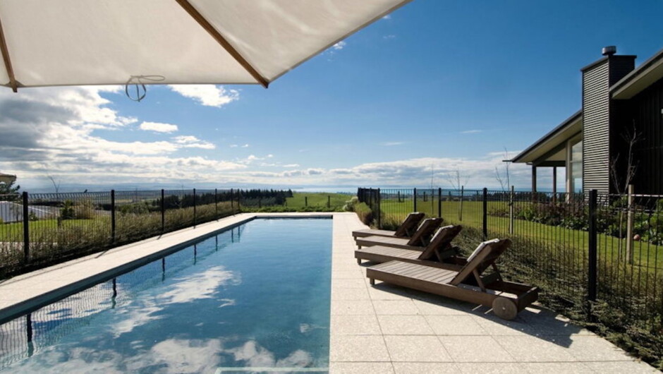Absolutely unique villa offers a stylish Hawkes Bay Holiday Home on a beautiful vineyard estate with panoramic views. This luxury accommodation is part of a 20-hectare estate with a shared swimming pool and pool house.