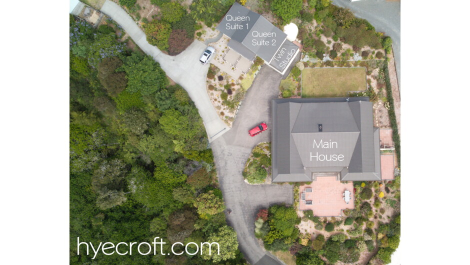 Set high at the end of a private right of way, our guest accommodation consists of three large units beside our main house. The two queen suites have lounge/dining areas with separate bedrooms. The twin studio has two king singles amalgamated with a dining/lounge area. All rooms have en suite bathrooms and outdoor patios. The complimentary continental breakfast, available daily in the dining room of the main house, is a convivial occasion, shared with the hosts and other guests, amongst an interesting array of objects collected over a lifetime. Comfortable rooms, convenient carparking, great views, breakfasts and conversation - welcome to our home on the hill.