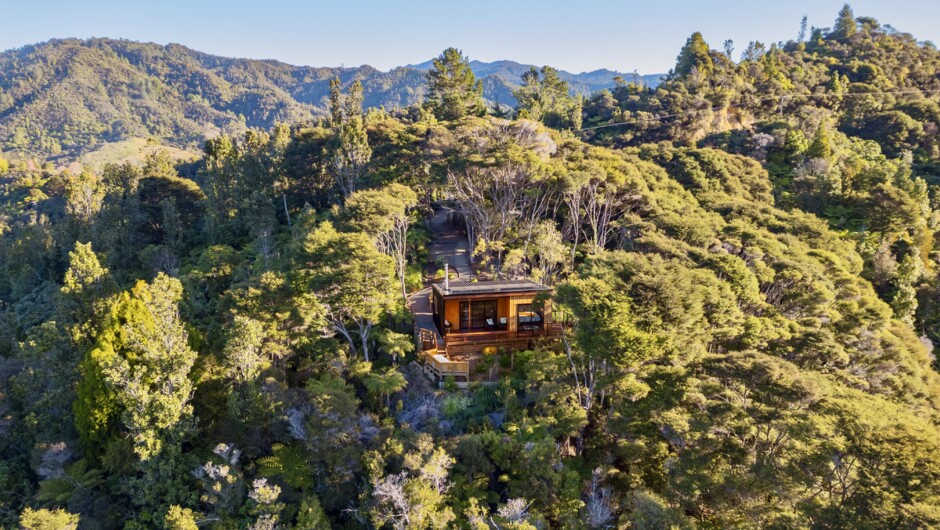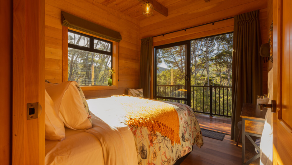 This cosy off-grid cabin is nestled in a lush, bush-clad valley. Complimenting the warm wooden hues of the cabin are the towering native Kanuka, Kahikatea, Rimu, Totara, and Rewarewa trees.