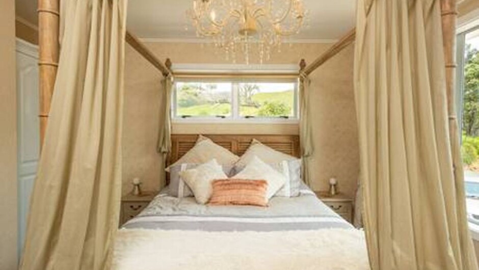 Onepu Moana Retreat "Sandy Sea" is a premium large holiday home in Opononi featuring extensive views of the stunning Hokianga Harbour. Each floor of this 2-storey home is fundamentally a self-contained 3-bedroom home, with a set of internal stairs connecting the two floors, so it is ideal for extended families & for adults/teens that want their "own zones". The top floor consists of a master with queen 4-poster, 2nd queen bedroom, triple bedroom (double-single bunk), bathroom, toilet-laundry, open-plan beautiful entertainers kitchen-lounge-dining & large deck with stunning sunsets. The bottom floor consists of a queen bedroom, double bedroom, 3-bunk (6-bed) bunk room, bathroom-laundry, toilet, & access to spa terrace with outdoor shower.