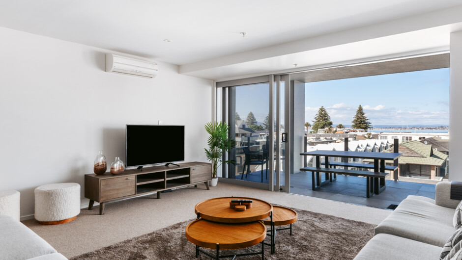 This immaculately presented three-bedroom apartment is designed for small groups, corporates, or those seeking a romantic getaway (please note, not suitable for children under 10). The stylish yet comfortable dining and living area invites relaxation, and air conditioning is installed for your comfort. Large floor-to-ceiling stacking doors open to the private balcony, where you can enjoy afternoon vinos and platters while basking in the sun and taking in the breathtaking harbour views. All three bedrooms are accessible from the living area. The master bedroom boasts a king-sized bed, a private balcony, a large walk-in wardrobe, and a dreamy ensuite.
