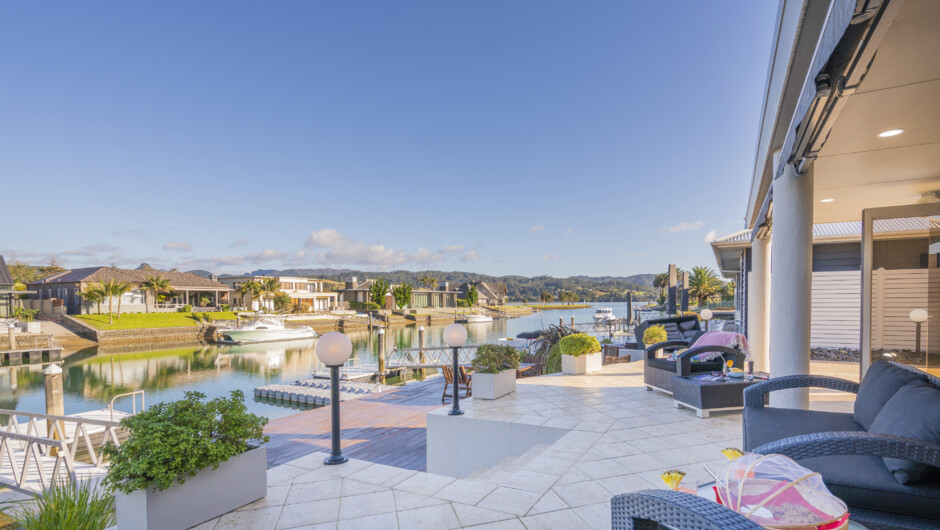 Enjoy stunning canal views and sunsets from this modern home. The canal-front deck provides a unique floating experience, while the courtyard offers shelter with wind-out awnings and a large umbrella for sunny afternoons. Relax outside with a drink and BBQ feast. Cook in the modern kitchen with a dishwasher, and enjoy open-plan living and dining. Unwind in the main lounge with a Smart TV, or keep kids entertained in the second living room with a TV and Chromecast. Sunset View accommodates your group comfortably with three bedrooms, two bathrooms, and laundry facilities. Boat parking is available for vessels up to 5 metres, making exploring the Coromandel region a breeze. Experience waterfront tranquility at Sunset View.