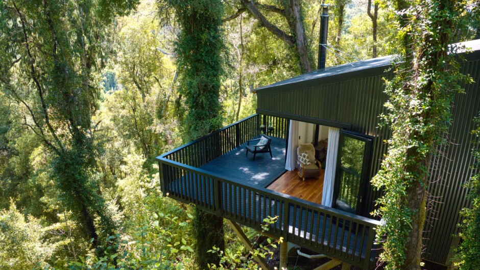 The treehouses are set on a 23 hectare forest block with private walking tracks and historic gold mining tunnels and caves to explore. The main unit contains a open plan space with a king bed and fully equipped kitchen with 4 burner stove and dishwasher, this has large doors opening to a spacious deck 6 metres in the air surrounded by giant forest trees, there are also skylights to allow stargazing at night. It contains a real log fire for heat and ambiance. A separate luxury bathroom with deep bath and window opening to the untouched forest is shared with the second unit. The second unit has a queen bed and loft single with blackout curtains and its own deck surrounded by forest and tea and coffee making facilities.