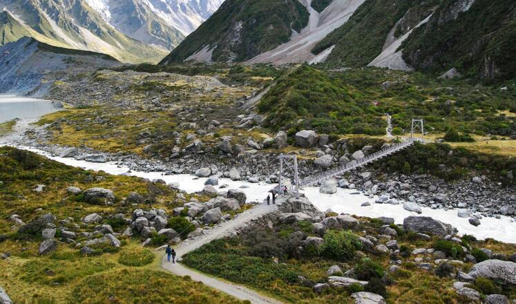 The River Walk Track through lush rainforest offers scenic views of Fox Glacier Te Moeka o Tūawe. It crosses the historic Fox River suspension bridge, and passes terrain shaped by glacier movements that reveal unique moraine formations.