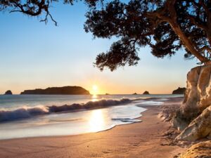 Hahei, located on The Coromandel, is an attractive beach fringed with pohutukawa trees and drifts of pink shells at the northern end. The offshore islands provide something of a breakwater, making this sheltered beach ideal for swimming, boating and fishing.