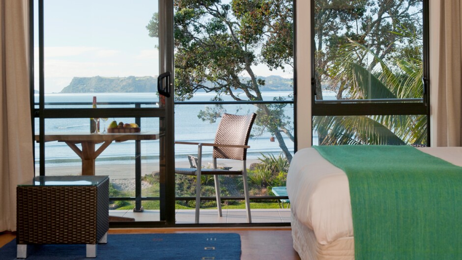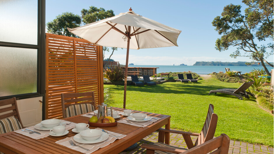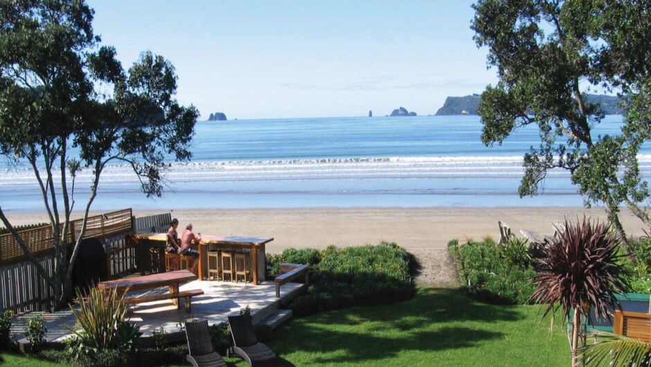 Absolute Beachfront - Coromandel accommodation. Immaculate quality self- contained units set amongst Pohutukawa trees right on a gorgeous beach. Spectacular views, spa pool, BBQ, beach bar, kayaks and more.