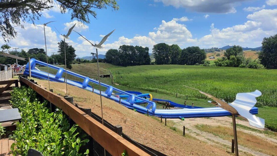 Afterwards whizz down and cool off on Waikato's best outdoor waterslides, there are 3 to enjoy. A fiberglass 55-meter slide complete with twists and turns, dual race inflatable slide and a kids 40 meter inflatable slide that allows people of all ages to experience the fun of sliding through the countryside.