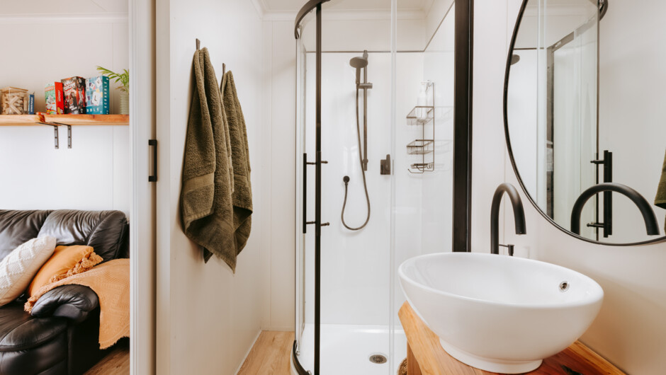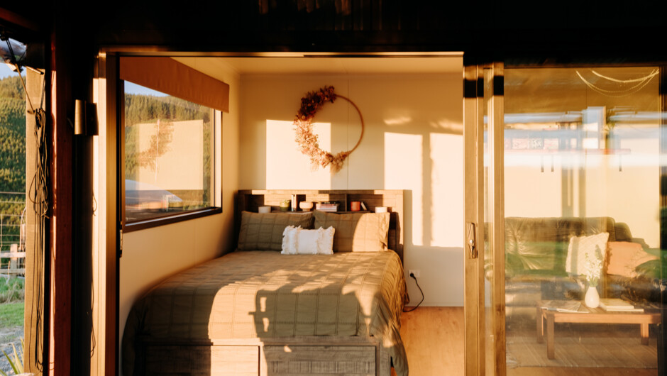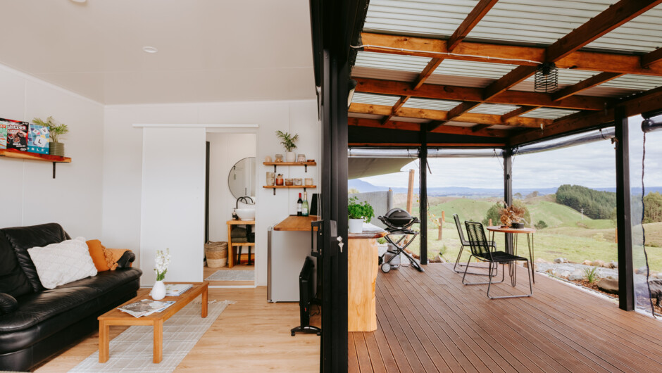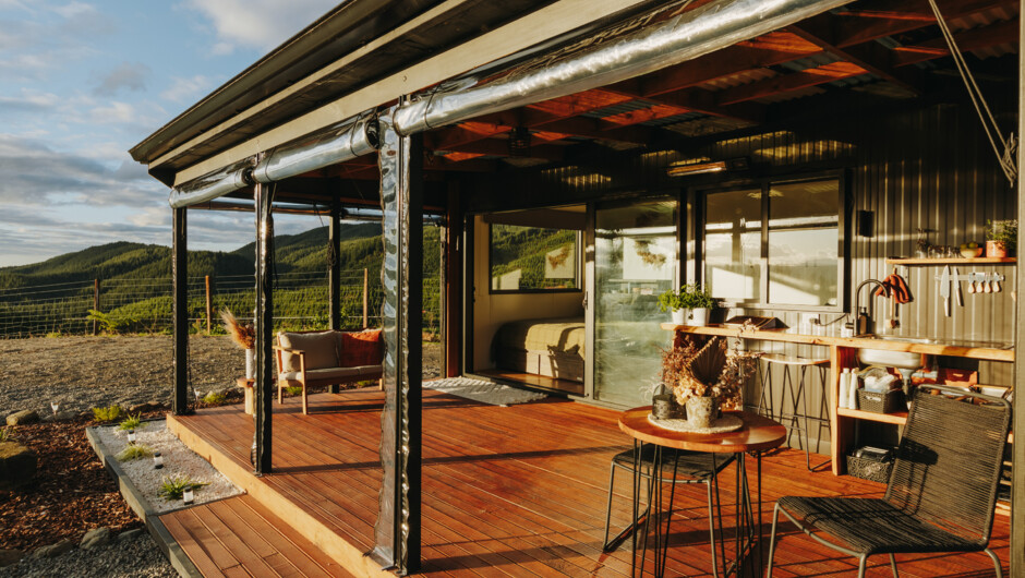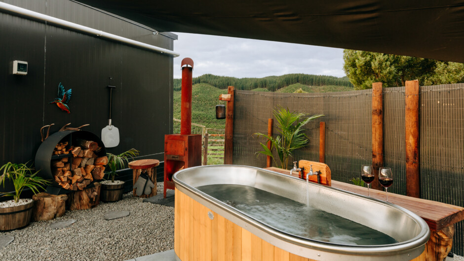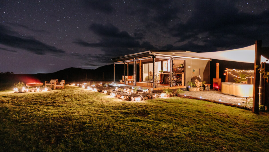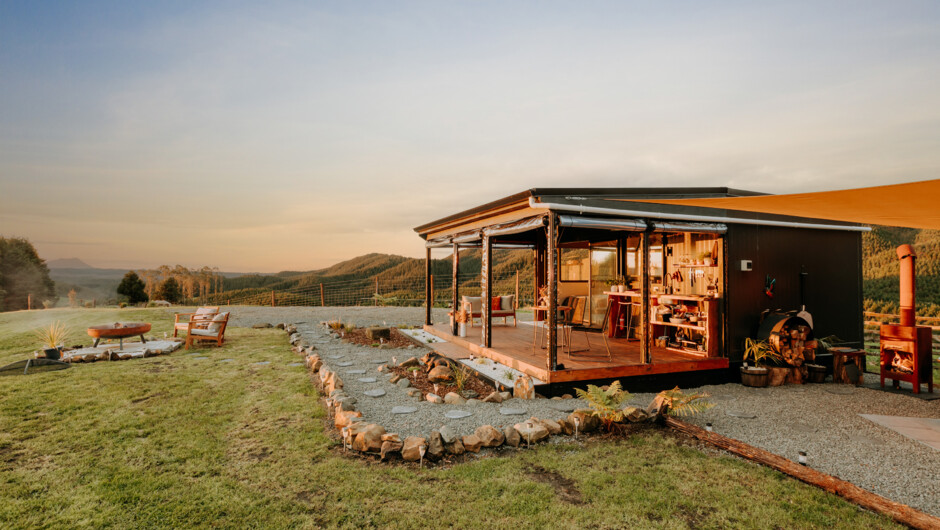 Blackberry Ridge is located 45 minutes from Whakatāne in the Bay of Plenty region. The interior of the cabin has restful, stylish decor with a comfortable queen bed and ensuite bathroom. The covered kitchen is on the deck straight off the cabin. Cook over the firepit, using the outdoor wood oven or gas cooker - then indulge in the sheltered outdoor bath with a glass of your favourite beverage on hand. As the day turns to dusk, vibrant hues of orange, pink, and purple paint the sky. The sound of the nearby forest and the fresh country air provide the perfect countryside ambiance for a serene and restful getaway.
