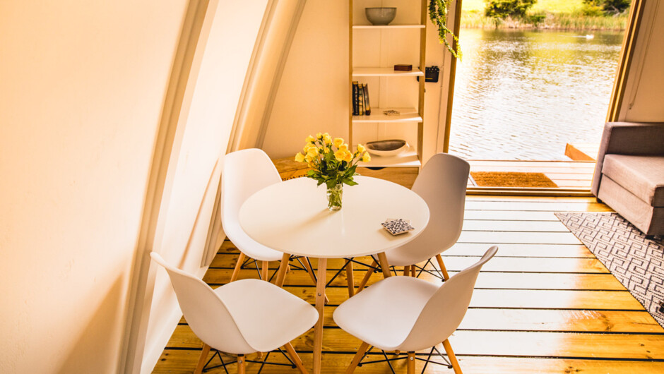 The Ark is a unique and beautifully decorated, floating house boat. It sits peacefully in a corner of a small private lake on a 16 acre property. The Ark is docked alongside a wharf where a nearby willow tree provides a cool outdoor living space - and a tranquil place to BBQ, sunbathe, read, relax, or enjoy a cool drink on a hot day. Inside is a small but perfectly formed space with an open plan and well equipped kitchen, dining, and lounge area, and bathroom. An incredibly comfortable queen size bed is accessed via a ladder in the loft.
