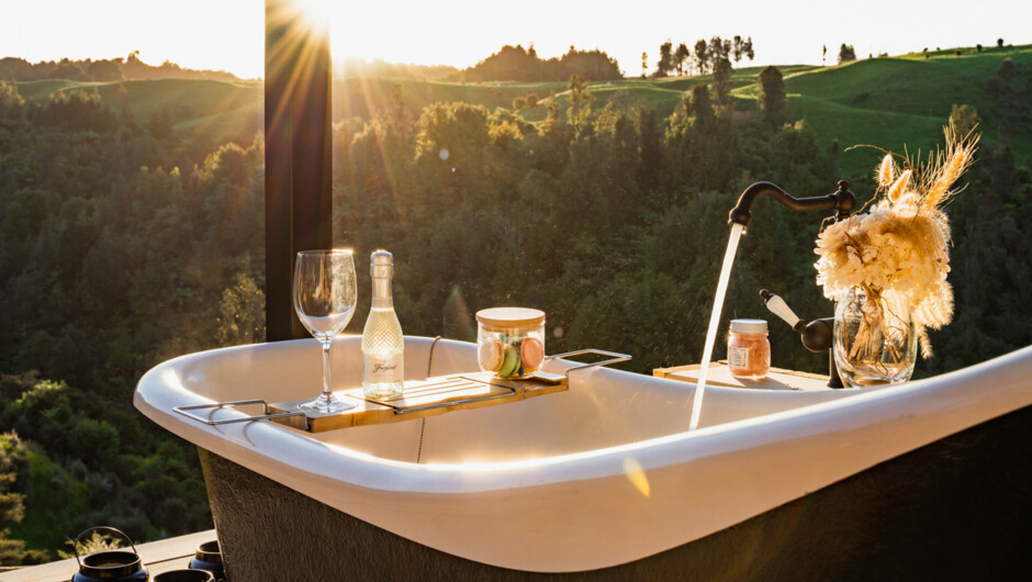 At one end is the bedroom hut, with the kitchen and bathroom hut in the middle, and finally the lounge hut - which can accommodate an extra couple or two children on a fold-out sofa. An outdoor tub on the deck outside the bedroom hut is perfectly positioned to enjoy the stunning sunsets and sunrises from the elevated position. The huts sit on a hill overlooking native forest and farmland. The native bush to the rear of the hut is rich with wildlife. You'll hear the rare and beautiful notes of the endangered kokako. And at night, if you're lucky, you'll hear the sound of kiwi calling.