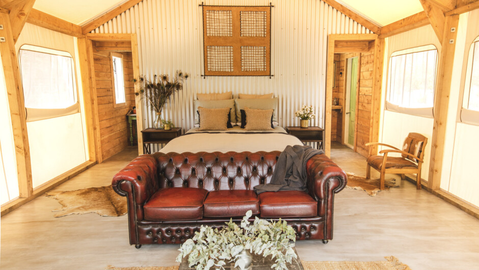 River's Edge has two separate luxury tents on the property both positioned in different private spots on the edge of a quiet, tree-lined river that runs through the farm. This listing is for Te Awa Tent, the most recent addition to River's Edge Retreat. The original tent at River's Edge is Ruru Tent. The front of the tent has a large glass frontage, offering a beautiful river-side view. Te Awa Tent is tastefully decorated, with luxurious textiles, leather and hide features - a touch of old-world charm with a modern twist. A wood burner stove creates a warm, comfortable, relaxing space in the cooler months. The tent has an ensuite bathroom with piping hot water and a flushing toilet. A second doorway leads to the kitchenette.