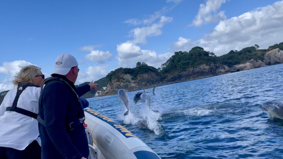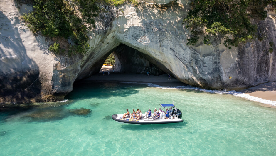 Cave Cruzer 7.8 metres, the only vessel this size able to navigate inside small caves, giant blowholes & caves. Dedicated to explore more spots only accessible by boat over 24kms, getting you closer, for the best unique, unimpeded (no roof) photos & views of wildlife in the Marine Reserve & majestic, volcanic, coastal views possible on the day. See Cathedral Cove, Shakespeare Cliff, Lonely Bay, Cooks & Hahei beaches & more. The only tour with music to experience the acoustics of New Zealand's 2nd largest sea cave, Orua. The prefect mix of time for pictures, local history & geological info. Optional rock jumping & to Snorkel amongst the fish or just view over the side.