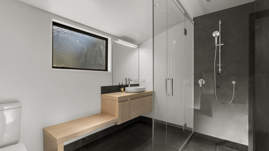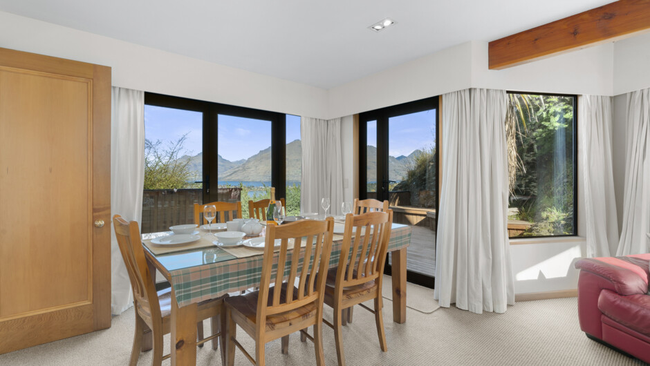 French doors open off the lounge/dining areas giving you two separate private outdoor living options. The view from the front deck is spectacular - you are in a private leafy enclosure looking out to breathtaking views of beautiful Lake Wakatipu, The Remarkables and Cecil Peak. Outdoor furniture makes this an ideal spot to sit and relax or enjoy a meal against an idyllic backdrop. The upper level of this light and roomy Queenstown holiday home offers a master bedroom with one king bed and a second bedroom with one queen bed. On the ground level, the third bedroom has two single beds. The home has two large bathrooms (one on each level with one newly renovated in 2021) and also full laundry facilities. Two heating options are available.