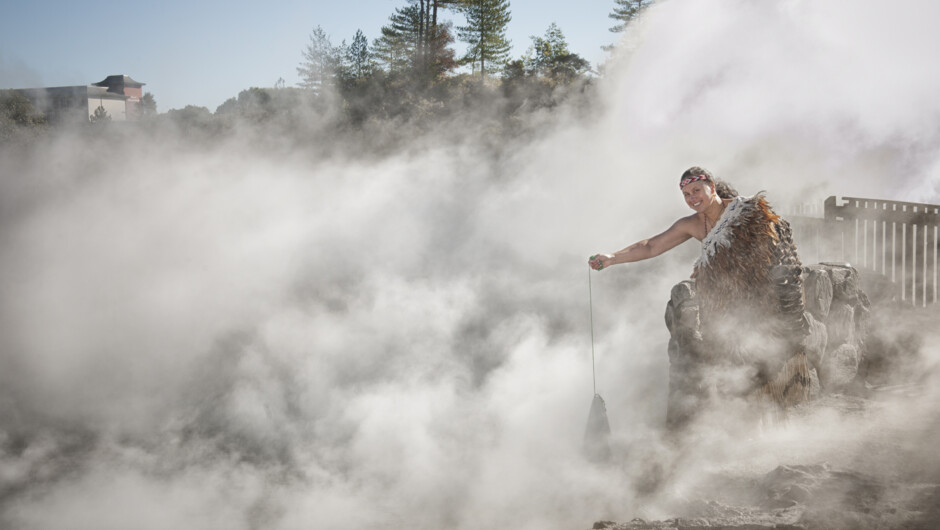 Walk into the real-world landscape on a walking tour of the Hobbiton™ Movie Set, and continue visiting the mighty Whakarewarewa Valley, for a truly culture rich experience, the home to a living Māori village and the New Zealand Māori Arts and Crafts Institute including a Hangi Pie Meal. Set amongst a highly active landscape erupting with geothermal activity where you can experience bubbling mud pools and the 30m-tall Pōhutu Geyser, which erupts many times daily. Explore an authentic living Māori village where people live on a daily basis, using natural geothermal resources to cook, bathe and heat their homes as they have for centuries. Enjoy a Hangi Pie Meal cooked in our hot pool topped with rich homemade gravy.