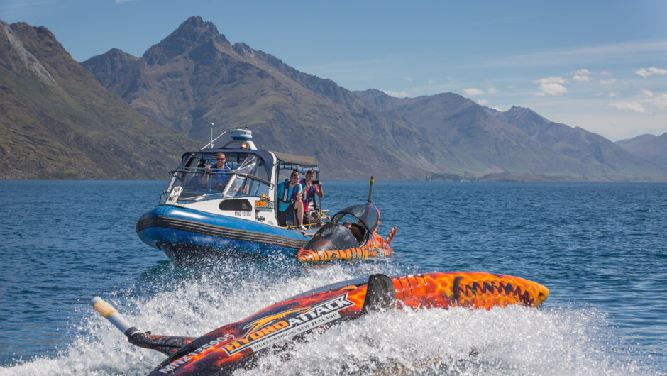 Minimum six riders. Departs on demand (requires booking 24 hours in advance). Head out in Hydro Attack's 12-passenger boat to a calm spot on the main part of the lake. Once in position, it’s time to up the adrenaline. Loading and unloading from the side of the boat, you can enjoy the same great experience in our semi-submersible shark as a single trip from the wharf. Like a stunt plane on the water - sit back in the warm dry cockpit and get ready to feel the g-forces as our expert pilot gives you a ride you'll never forget. Then settle back on the boat to watch your friends, family, and other passengers have a turn. A great option for photo opportunities. The Boat Trip and Shark Ride is also our windy weather option.
