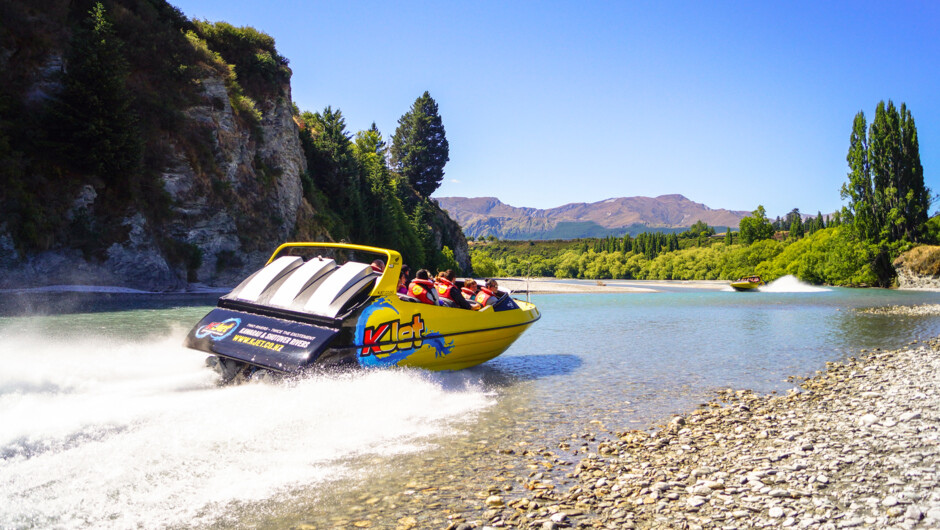 Every hour from the Main Town Pier in Queenstown, Kawarau Jet (KJet) takes you on an hour long Jet boat ride across Lake Wakatipu and into the channels of the Shotover and Kawarau Rivers.
