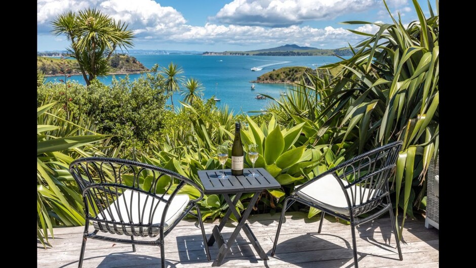 Situated in a peaceful setting perched about Matiatia Bay, are twin studio apartments with spectacular views. The units are side by side, each with a deck looking across the bay, but they share a large & private courtyard with outdoor dining furniture. An easy stroll from the ferry, and up to Oneroa Village. Each studio consists of an open plan living & bedroom, opening onto a lovely deck with stunning views across the bay. They are stylishly furnished & well set up with a kitchenette & bathroom, WIFI & TV. Perched above Matiatia Bay, the property is surrounded by native bush and the humming sound of the bees and cicadas. The main village of Oneroa with many shops, galleries, cafes, restaurants and the white sands of Oneroa Beach.