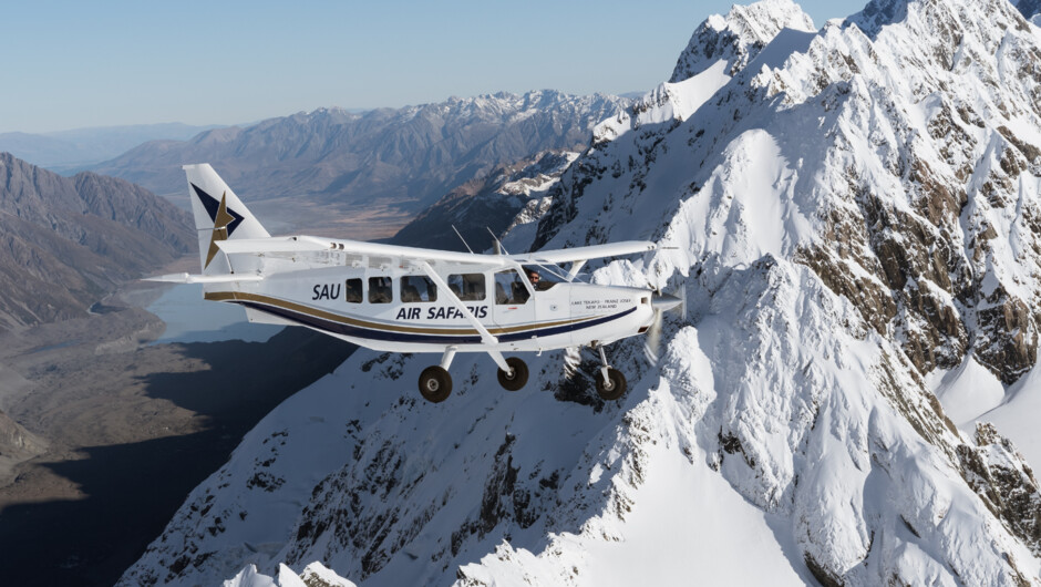 Experience a spectacular scenic flight that explores the Mount Cook and Westland National Parks flying over New Zealand’s highest mountains and largest glaciers. Our aircraft offer a window seat for all passengers and have wings-above for unobstructed viewing below. Your friendly pilot will provide an informative and enjoyable commentary.