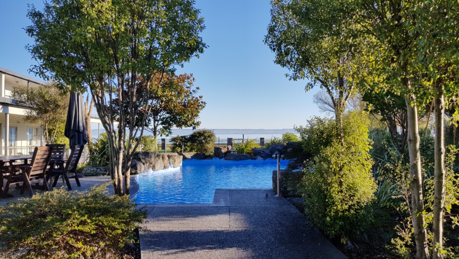 Guests can enjoy a relaxing massage and sauna in the resort's award-winning Wai Ora Day Spa. The outdoor pool overlooks the lake.