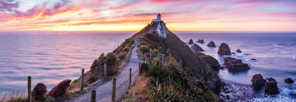 努盖特角(Nugget Point)是奥塔哥(Otago)海岸上最独特的地貌之一。这是一座陡峭的山岬,矗立着一个灯塔,并散布着众多岩石小岛(犹如金块)。 从努盖特角步行5分钟便可到达灯塔,欣赏海岸线两端迷人的风景。从灯塔向下看去,能够见到众多的海豹懒洋洋地躺在岩石上,或者在礁石间游泳嬉戏,享受慵懒舒适的怡人时光。最好随身携带望远镜,以便能近距离观察生活在这里的海豹群。