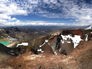 在山谷的尽头,步道变得陡峭,从山谷向上延伸至瑙鲁赫伊山 (Ngauruhoe) 和汤加里罗山 (Tongariro) 之间的芒格蒂帕帕山口 (Mangatepopo Saddle)。在这里可俯瞰令人惊叹的火山地形全景。在晴天时,你可以看到远处的塔拉纳基山。