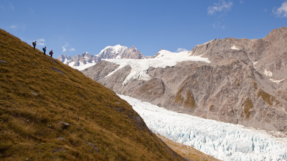 步道从钱斯勒木屋蜿蜒而上,穿过雪草盆地,塔斯曼山豁然出现在眼前,好一派壮丽景象。在这里,导游会做好安全保障,组织到溪谷登高。溪谷通往钱斯勒峰下宽阔的山脊和美丽的雪坡。向海拔2004米高峰的冲刺是这次旅行的亮点。到达山顶,南阿尔卑斯山脉最高峰无以伦比的美景和滋润了福克斯冰川的壮丽冰原就一览无遗。向西,塔斯曼海惊涛拍岸,在吉勒斯比海滩卷起千堆雪。
