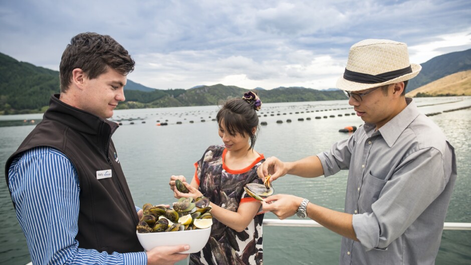 青口贝巡游的登船地点——地处马尔堡(Marlborough)大区的哈维诺(Havelock),是新西兰青口贝(Greenshell™ Mussels又名绿唇贻贝)的主要产区。整个马尔堡地区生产了全新西兰70%的青口贝,马尔堡同时也是新西兰最大的葡萄酒产区。跟随我们出发,巡游于世上最美海峡之一的马尔堡海峡,体验宁静的海上风光,并参观青口养殖场。我们专业而热情的船长和船员将为您讲解(英文讲解)新西兰青口贝的养殖过程、产业故事和它的独特之处,体验新西兰的海水养殖业与大自然间的和谐之道。您将会在船上品尝到现煮的新鲜青口贝,佐以与之相配的马尔堡长相思(Sauvignon Blanc)白葡萄酒。