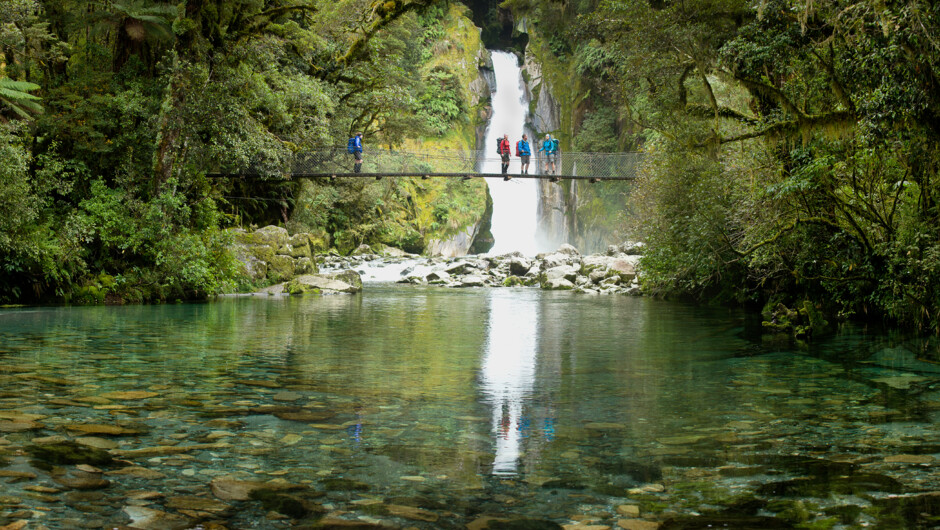 领略米尔福德步道的雄奇之美——崎岖的山峰、陡峭的峡谷以及壮观的瀑布。在纯净的河流和葱郁的雨林间穿行,随后穿过麦金农通道,到达壮美的米尔福德峡湾。