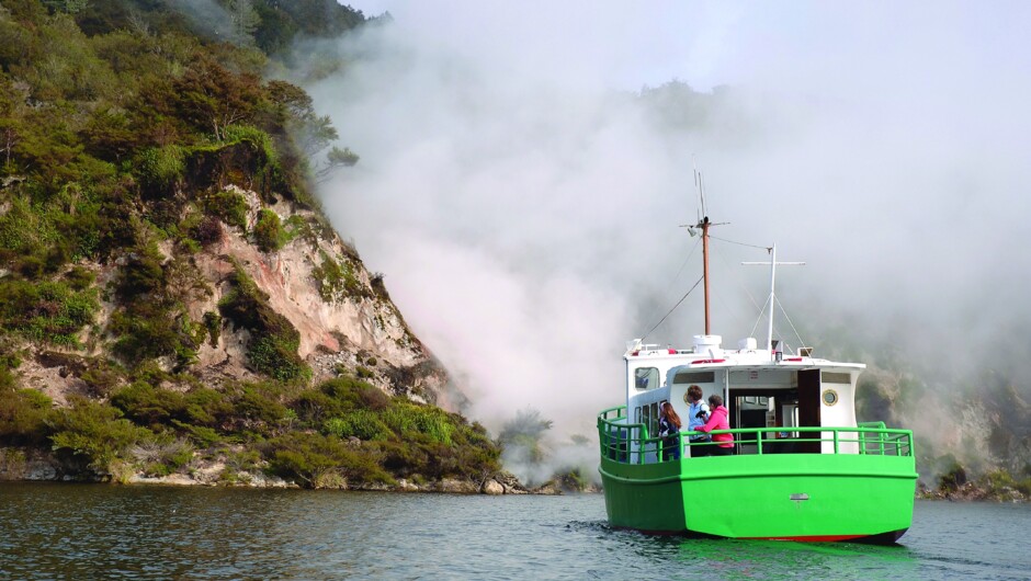 最后登上游船,巡游于优美的罗托玛哈那湖上,观看步行难以到达的珍稀地热景观。船长会沿途指出精彩地点,并且讲解罗托鲁瓦地热区的历史。