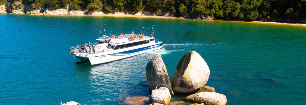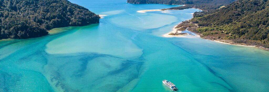 Embark on a scenic boat cruise through the breathtaking Abel Tasman National Park in Nelson Tasman, where golden beaches meet crystal-clear waters and lush native forests.