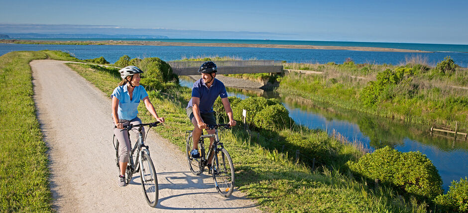 Following the Tuki Tuki River trail, make your way to the coast and the East Clive wetlands, home to a range of New Zealand's native birds. The countryside is dominated by apple orchards, vineyards and market gardens, which gives the region it's status as the Food Bowl of New Zealand. The trail takes you along the Norfolk Palm lined Marine Parade to the centre of Napier, the ‘Art Deco Capital of the World’. Spend some time exploring the city's distinctive architecture before the final 5km cycle back to Ahuriri.