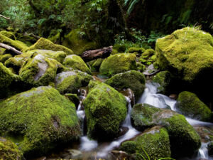 Ein Bohlenweg führt über das Moor von Ahukawakawa. Die torfhaltige Sumpflandschaft ist so empfindlich, dass ein einziger Fußabdruck jahrelang sichtbar bleiben kann. Nach dem Überqueren des Oberlaufs des Stony Rivers geht es zwischen pittoresken Bergzedern bergauf über den Pouakai Track, der schließlich zur gleichnamigen Hütte führt.