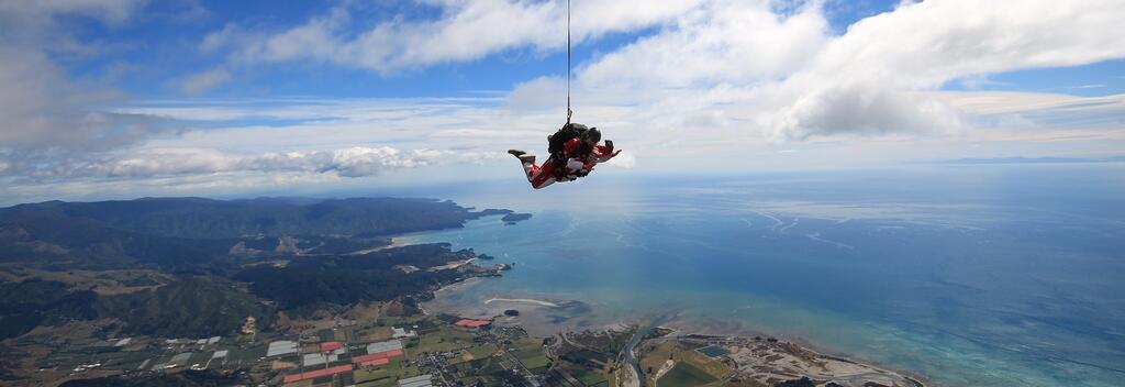 Mach einen Fallschirmsprung über dem Abel Tasman National Park(opens in new window), bei dem du sowohl die Nord- als auch die Südinsel Neuseelands sehen kannst. Die Landschaft wird dir den Atem nehmen, wenn du über Bergen, mit üppigem Busch bewachsenen Hügeln, Flüssen, Obstgärten, Weinbergen und goldenen Stränden schwebst. Wenn du mehr von der Schönheit Nelson Tasmans aus der Luft zu sehen bekommen willst, stehen dir zahlreiche Hubschrauber- und Rundflüge zur Verfügung.