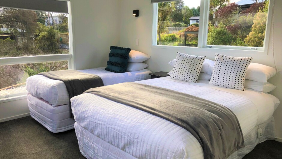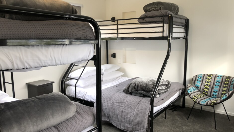 Bedding configuration is – 3x Queen, 1x Single, 2x Sets of bunks (Single over Double, and Single over Single), 1x Single Floor mattress (the floor mattress, and top bunks are only suitable for children. For this reason we allow no more than 10 adults per booking). https://lakesideaccommodation.co.nz/terms-conditions/