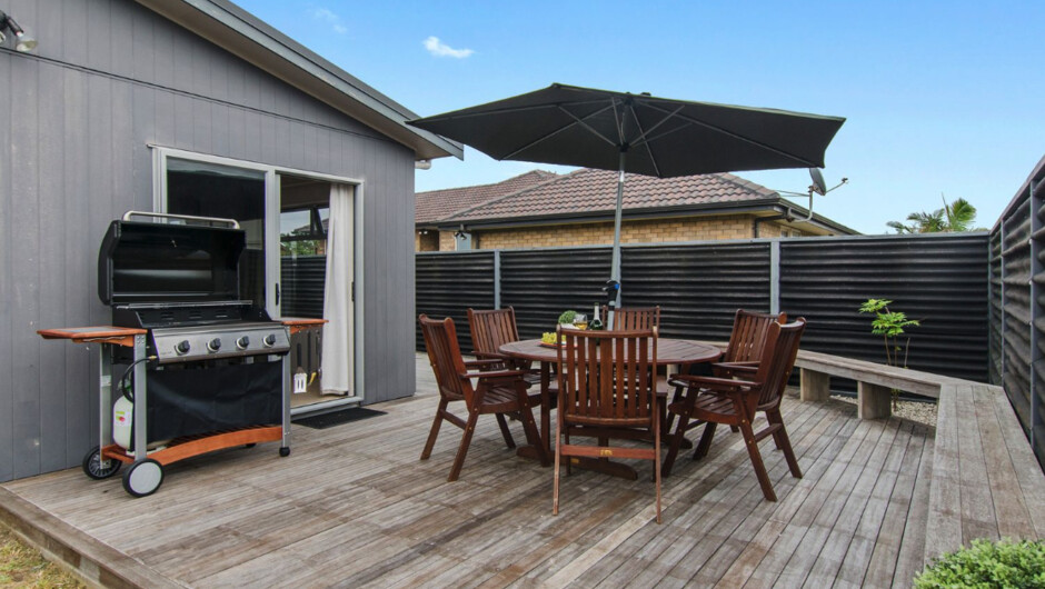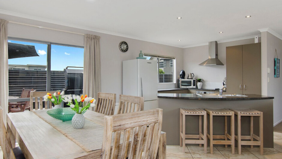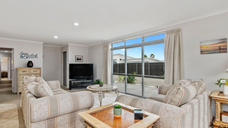 Head out to the sundeck and kick your feet up on the outdoor dining furniture. This home has an expansive outdoor area, with tons of outdoor dining furniture or seating. And with a new BBQ on hand, your well equipped to host a classic Kiwi BBQ. The home also has a large sealed driveway with plenty of space to park your car or boat. The interior of this home is light and spacious, with an open plan living area featuring stylish furnishings and modern finishings throughout. And with space to sleep 9 across 4 bedrooms, there is plenty of space to accommodate multiple families or groups.