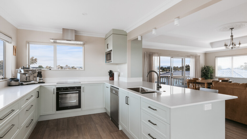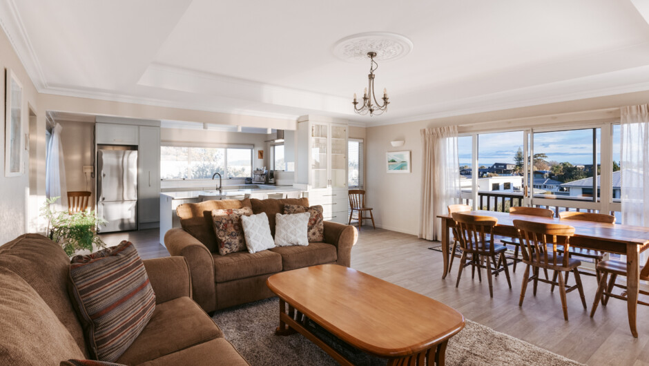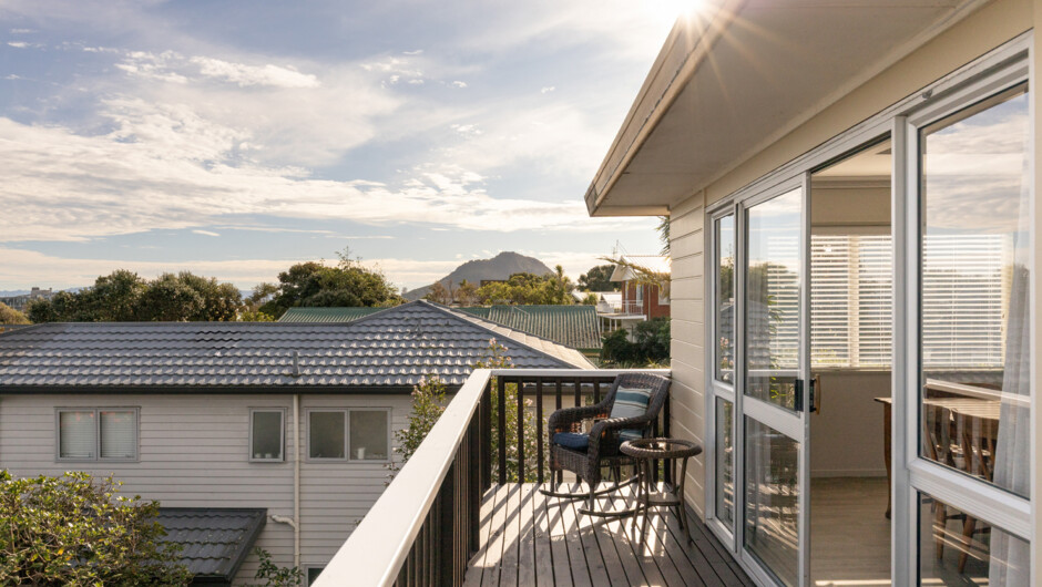 The Baywatcher is a charming 3-bedroom bach perched on the hilltop of Orkney Road, boasting stunning views over the bay, the Mount, Harbour Hills, and a cheeky glimpse of the ocean.
