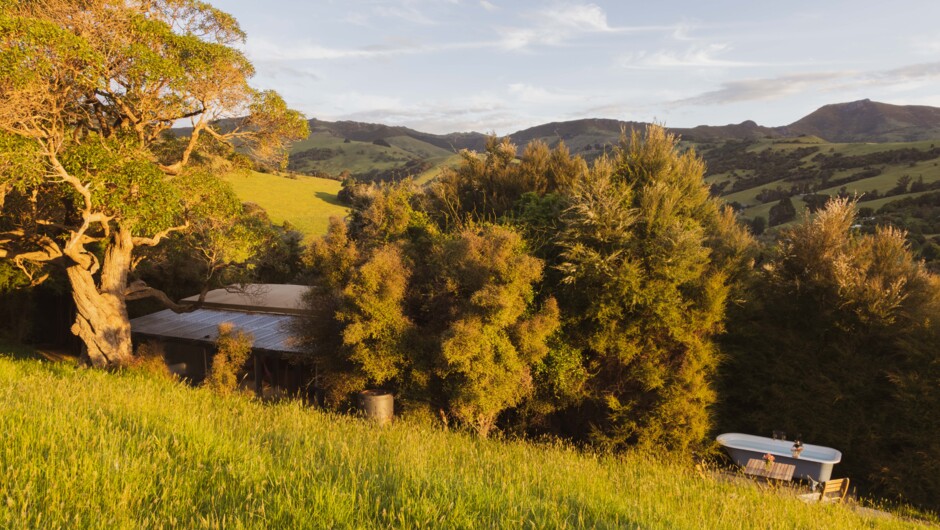 The one-room tent-hut hybrid is set high up in a hidden spot on the property, surrounded by native trees and bush. A short 10-second stroll takes you to a deck platform with an outdoor bath and dining table - perfect for soaking up the glorious Banks Peninsula views. It's a unique little building - with the roof of the hut in canvas, solid walls forming the sides and large french doors creating a completely-glass sidewall. There is a feeling of being very much part of the natural surrounds.