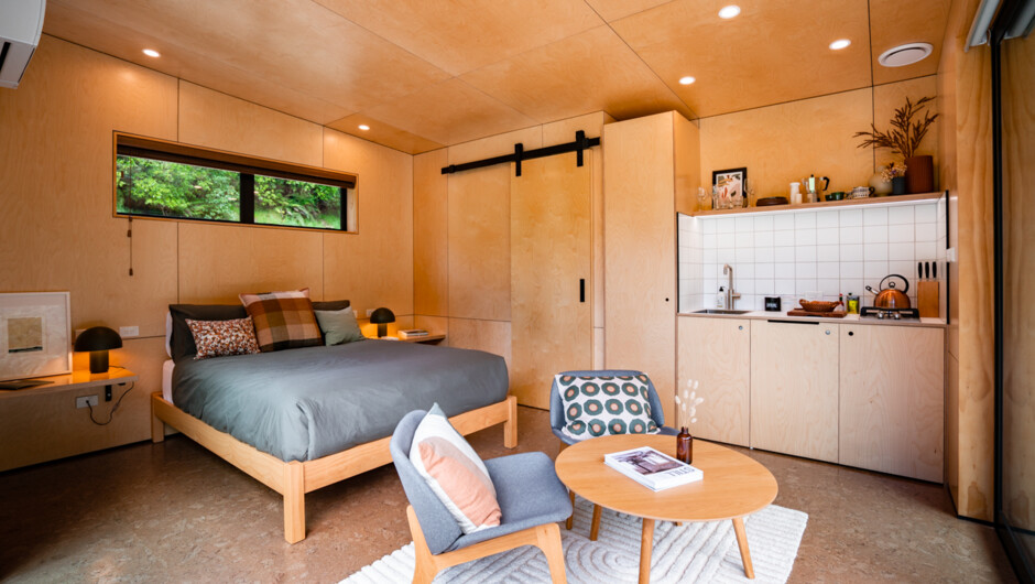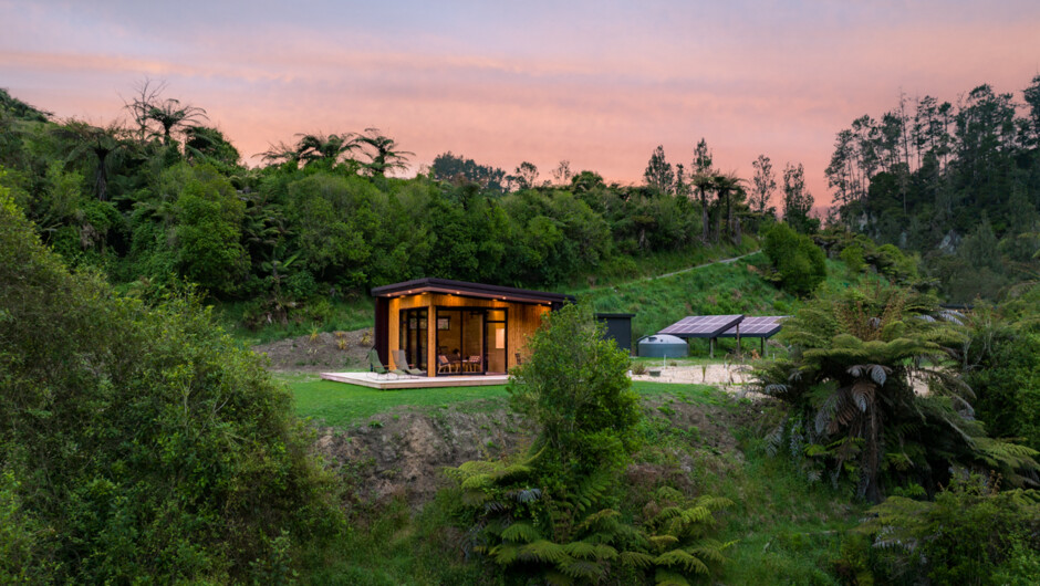 Watercliff includes four luxurious and comfortable, self-contained and eco-friendly cabins. This cabin, known as 'The Nest' is a cosy escape for couples. The stylish, restful interior consists of a kitchenette, a modern bathroom and a living space with a queen-size bed. Outdoors you’ll find a large semi-covered deck with an outdoor bath, lounge chairs, a dining area and a BBQ. In the morning, open your automatic blinds to reveal the picturesque sunrise without leaving your bed. Once you're up, enjoy a stroll down the path through the native bush to a small waterfall, swimming hole and secluded beach along the riverbank. The seclusion of the site and its location in the beautiful native bush is truly peaceful and serene.