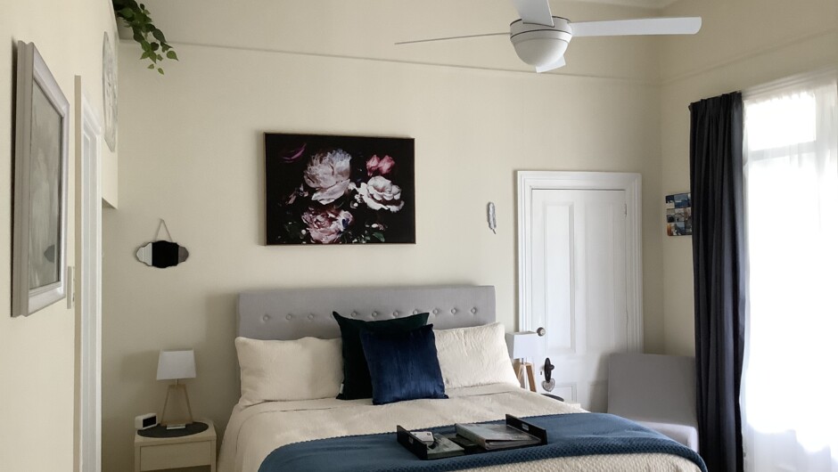 Chelsea House offers guests a choice of two spacious ensuite rooms. Quality linen, electric blankets, ceiling fans and well appointed rooms provide a comfortable stay. The Parihaka Room has ‘traditional villa’ style decor, with high ceilings/ceiling rose, coloured glass panes sash windows. A Super King bed adds luxury comfort. The Ledwith Room has a comfortable King bed. Decorated in a contemporary style, the room has high ceilings/ceiling rose. French doors open onto the veranda & seating area overlooking the garden. A generous guest lounge to relax or watch TV/Netflix & use the Free WIFI to catch up on family news. A well provisioned tea & coffee buffet is available and a delicious continental breakfast is served.