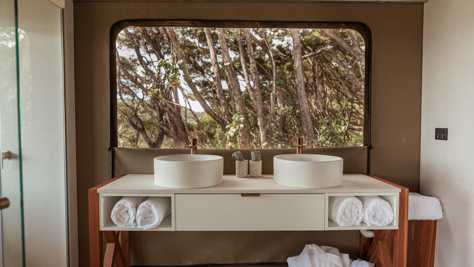 There are two luxury glamping structures available. Nestled high among the trees, Tent Kānuka boasts breathtaking views over Golden Bay and beyond, with a beautifully appointed glass balustrade that ensures that no aspect of the view is compromised. Tent Korimako engulfs the ocean and sunset view. Surrounded by native bush this Tent enjoys full afternoon sun. Soak in imported vintage baths on the deck and watch the sun set every day, while the comfort and convenience of a fast unlimited WIFI, super king bed, outdoor BBQ, beach towels, bath robes, luxury linen and bath towels, slippers, and luxury toiletries making your stay a truly relaxing and indulgent experience.