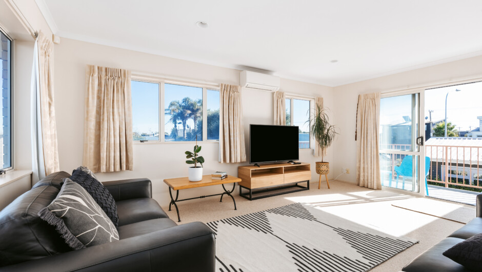 It accommodates up to eight guests across four bedrooms, making it the perfect place to create holiday memories. Feel right at home at Family Treasure. Built over two levels, the heart of the house is positioned on the upper floor. It features a large living area equipped with a Smart TV, a heat pump, and comfortable couches for relaxation. The sliding door opens to your private balcony, where you can enjoy your morning cup of tea while listening to urban Papamoa life and the gentle sound of the waves breaking. Your group has a selection of four bedrooms. The master on the second floor features a super king bed, a spacious walk-through wardrobe, and a shared ensuite.