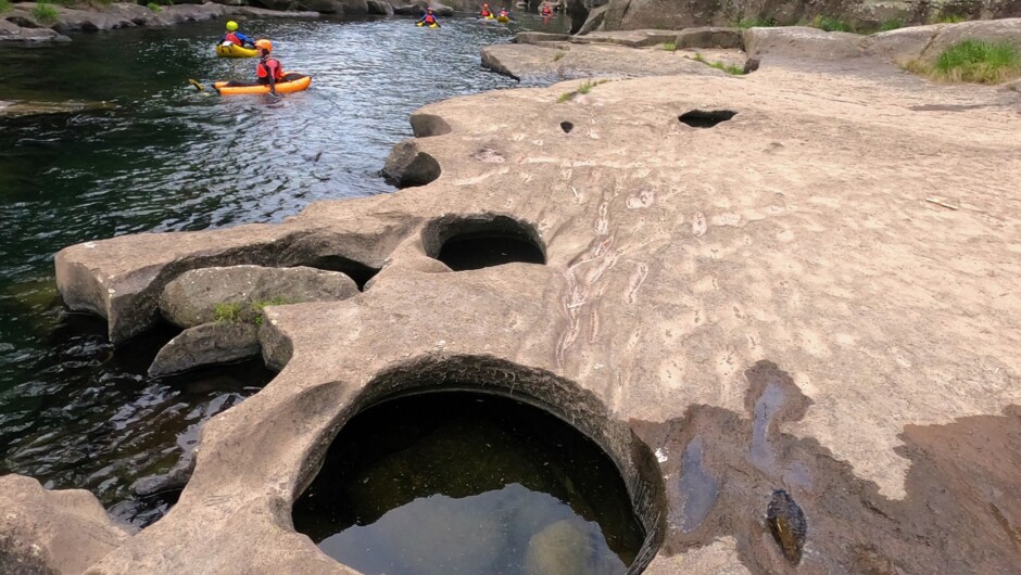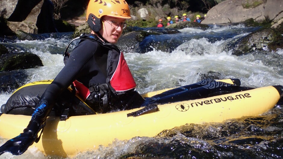 Our riverbug tour starts at the iconic Poripori Water Holes on the Wairoa River near Tauranga. You can meet us at the river and we also offer a pick up service from Tauranga if you don't have own transport. Kitted out in wetsuits, safety gear, funky webbed gloves and flippers, we carry our bugs to the river to try them out. It’s super easy to learn and loads of fun. Against a backdrop of native forrest we explore the Wairoa’s amazing geology drifting through deep pools, sliding between rocks and down small drops amongst the Wairoaʻs impressive pot-holes carved out of the bedrock by stones and water. Splash around, try a few cool tricks and games, or just relax and take in the awesome scenery of this special place.