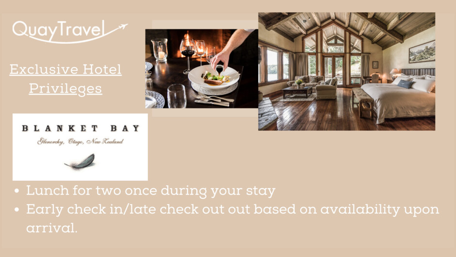 Quay Travel is a member of the global Signature Travel Network, who share one objective: to serve the unique needs of discerning travellers. Our clients have access to our Quay Exclusive Hotel Privileges at many of the luxury hotels and lodges around New Zealand. While our clients can't travel internationally for now, we have created some wonderful experiences in New Zealand. Whether you are just looking for a few nights at a luxury lodge with a loved one or a road trip with family and friends we have you covered. We have put together some ideas and inspirations and listed these under our 'specials' tab of our website so take a look. Your travel advisor is here for you 24/7 so give us a call to chat about your next holiday.